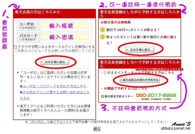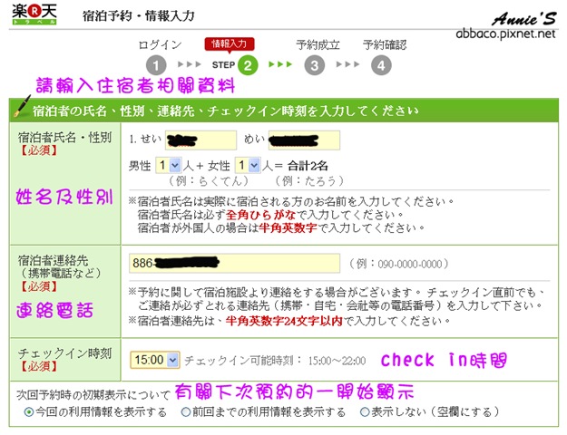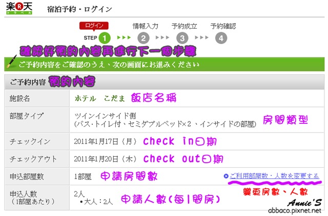 照著教學填寫了,雖然我的情況不太一樣,是先在台灣樂天有了會員, 所以到了日本樂天訂房的填寫表格有點不太一樣, 不過苦惱的我照著教學終於訂好房間了:) 非常感謝你清楚的教學喔~